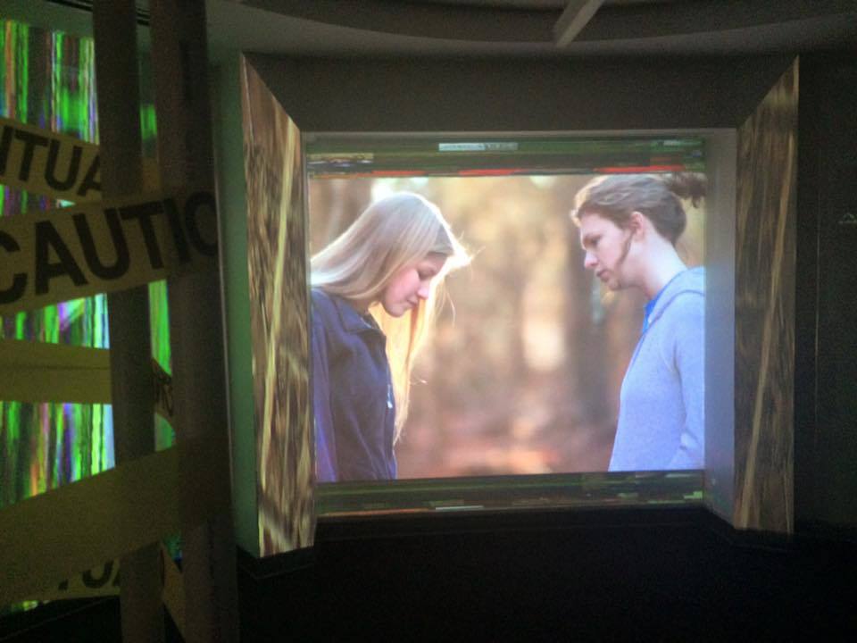 Phantomythography: A Young Ghost Comes of Age – is a multi-projection video installation piece, exploring the fiction of memory and identity through the lens of a queer Southern space. A haunted forrest is constructed through fragmented screens, upon which the distorted, disjointed narrative of two girls caught in a never ending game of chase unfolds.