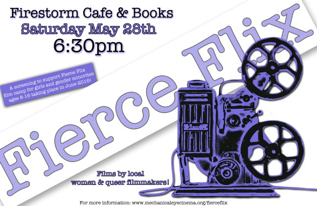 A screening to support Fierce Flix featuring films by local women and queer filmmakers. Work by Anne Slatton, Patricia Furnish, James Theophilos, Constance Humphries, Charlotte Taylor, Jessica McPhatter, Kari Barrows, and more!